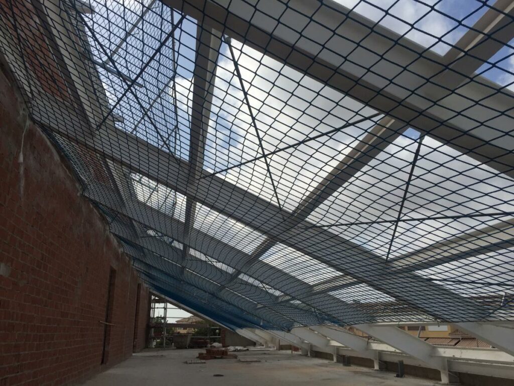 Es una aplicación crítica en la rehabilitación de tejados frágiles (como fibrocemento o cubiertas antiguas) o con grandes pendientes. La red se despliega inmediatamente debajo de la cubierta para detener al operario si este rompe la superficie del tejado, previniendo así caídas al vacío.